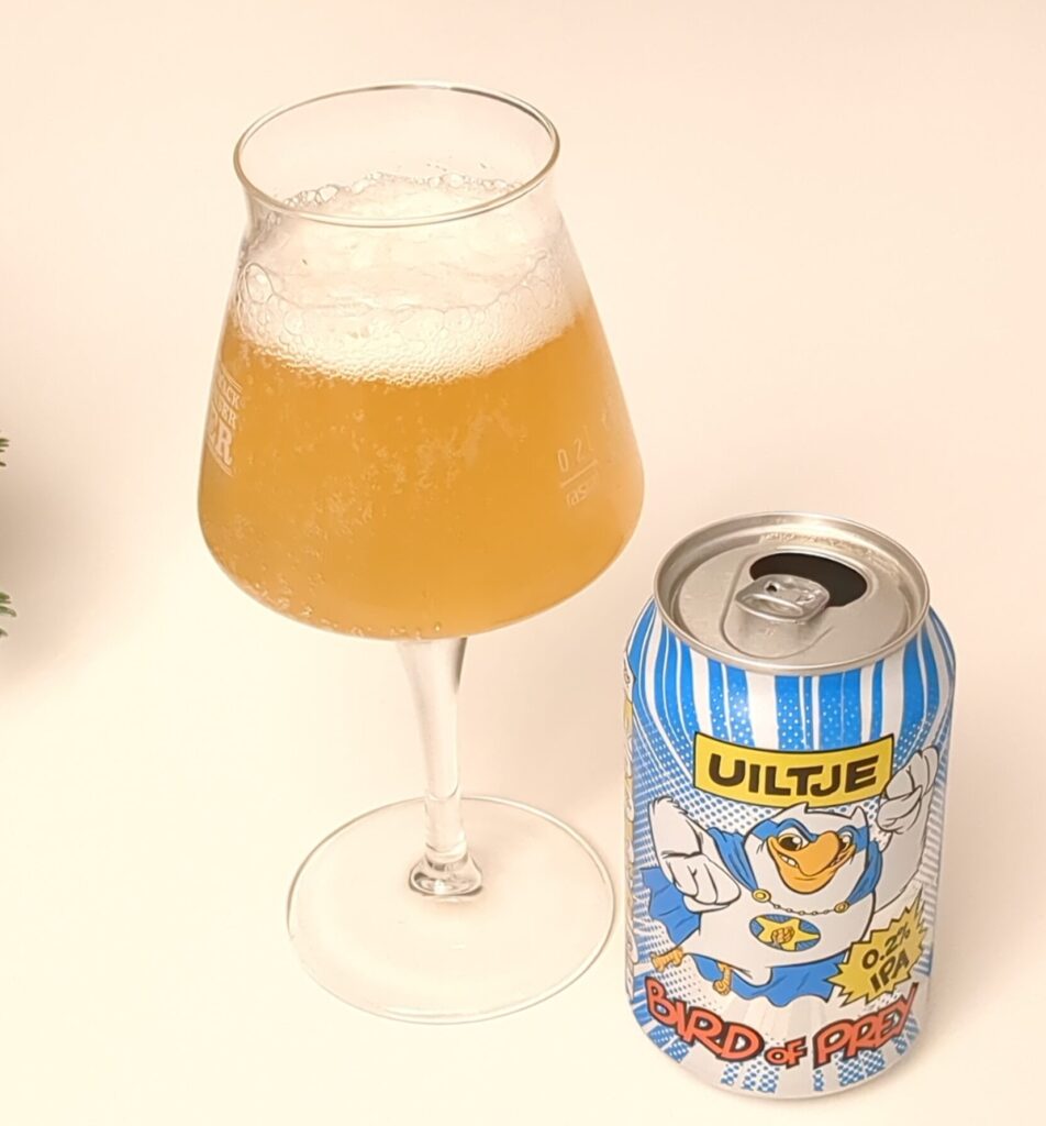 Das Bird of Prey von Uiltje, ein 0,2% IPA, kommt mit witzigem Comic-Label, sogar mit Comic-Strip. Und mit Weizenmalz – mal sehen wie das zu einem Raubvogel passen soll.
