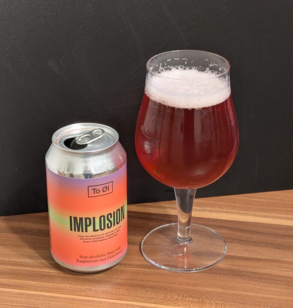 Heute kommt also To Øls Implosion – ein alkoholfreies Bier mit Himbeere und Holunder. Knallrot wie eine Limo aus den 70ern. Die erste Überraschung ist optisch: Das ist kein Bier-Getränk, das ist eher eine Farbexplosion. Das gilt für die Dose und für den Inhalt.