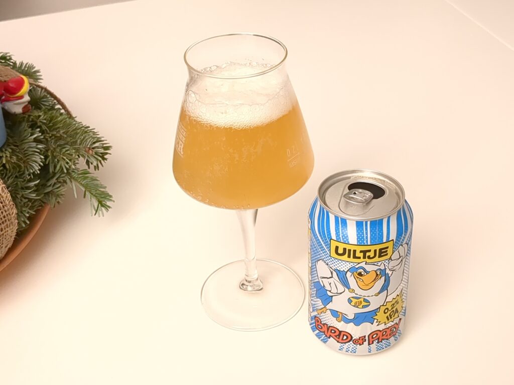 Das Bird of Prey von Uiltje, ein 0,2% IPA, kommt mit witzigem Comic-Label, sogar mit Comic-Strip. Und mit Weizenmalz – mal sehen wie das zu einem Raubvogel passen soll.