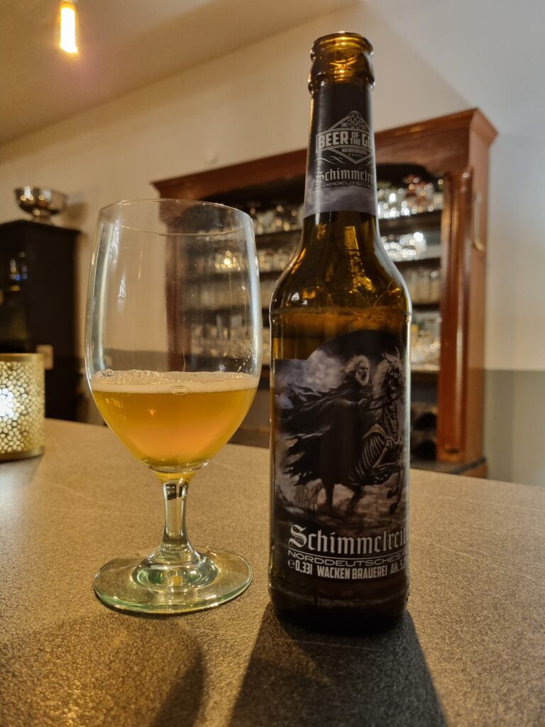 Einmal im Jahr wird die norddeutsche Tiefebene in der Ruhe und Gemächlichkeit eigentlich das Ideal der Existenz darstellen, von dröhnendem Rock erschüttert – nämlich dann wenn die Metalheads im Herzen des Kreises Steinburg zum Wacken Festival zusamenstömen. Und strömen tut bei dieser Gelegenheit seit jeher auch das Bier, damit war es nur folgerichtig, dass die Wacken-Crew eine eigene Braustätte einrichtet, in der seit ein paar Jahren unter dem Motto „Beer of the Gods“ eigenes Wacken-Bier gebraut wird. Das Pils aus dieser Produktreihe ist nach dem rastlosen Küstengeist „Schimmelreiter“ benannt. Der gleichnamige Roman von Theodor Storm spielt seinerseits eine zentrale Rolle im Schaffen des dithmarscher Künstlers Jens Rusch, der zudem dem Wackenfestival herzlich verbunden ist. Er stammt aus Neufeld und das ist ja nur ein paar Kilometer den Kanal hoch (oder runter, je nachdem). So war es wiederum folgerichtig, dass Jens Rusch das Artwork zum Schimmelreiter-Pils beigesteuert hat.